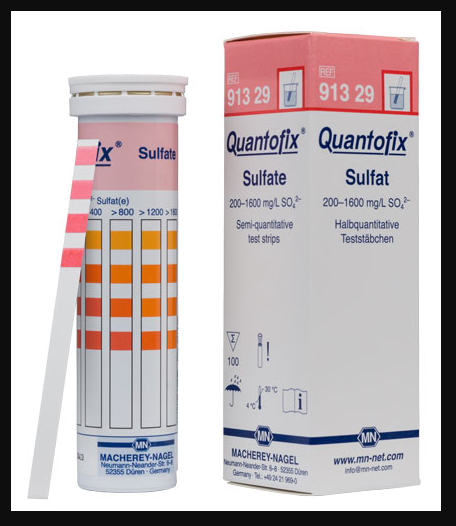 QUANTOFIX Sulphate semi-quantitative test strips for the determination of sulphate in solutions. Measuring range: <200->400->800->1200- >1600 mg/L SO42-