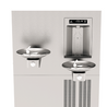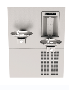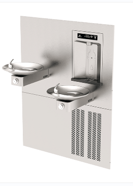 Model 1011HSA.8 RIVIVE™ Hydration Station™ vandal-resistant wall-mounted ADA chilled drinking fountain and recessed motion-activated bottle filler features dual 18-gauge Type 304 Stainless Steel satin finish basins with integral swirl design, 14-gauge Type 304 Stainless Steel wall brackets, 100% lead-free waterways, vandal-resistant push-button operated stainless steel valves with front-accessible cartridge and flow adjustment, polished chrome-plated brass vandal-resistant bubbler heads with integral laminar anti-squirt flow, chrome-plated brass vandal-resistant waste strainers, vandal-resistant bottom plates, stainless steel satin finish back panel and louvered intrusion-proof grill, high and low fountain mounting levels, and 1-1/4" (3.2 cm) O.D. waste pipes. Bottle filler includes a 3000 gallon (11356 L) capacity, Electronic Lifecycle Control filter cartridge, with filter replacement indicator light, LED lighted 12" sensor operated bottle opening with quick 1.1 gpm fill rate and laminar flow with front access for changing filter, smart energy savings feature powers down refrigeration system after 2 hours of non-use, auto purge feature automatically cycles water once every 24 hours, display menu which shows sensor range adjustment, factory reset, software/firmware version readout and error readout, along with bottle counter showing number of bottles saved, and vandal-resistant sensor resists scratching and water droplet fowling. The refrigeration system is hermetically sealed and delivers a minimum of 8 gph (30.3 L) of water at 50° F (10° C) cooled from 80° F (26.7° C) inlet water at 90° F (32.2° C) ambient. 115 Volts, 60Hz, rated watts: 370, full load amps: 5