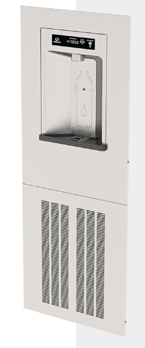 Model 2000HSA.8 RIVIVE™ Hydration Station™ motion-activated bottle filling station with architectural roots is recessed wall-mount wheel chair accessible, constructed of heavy duty, Type 304 Stainless Steel with a satin finish, and stainless steel satin finish back panel and louvered intrusion-proof grill. Bottle filler includes a 3000 gallon (11356 L) capacity, Electronic Lifecycle Control filter cartridge, with filter replacement indicator light, LED lighted 12" sensor operated bottle opening with quick 1.1 gpm fill rate and laminar flow with front access for changing filter, smart energy savings feature powers down refrigeration system after 2 hours of non-use, auto purge feature automatically cycles water once every 24 hours, display menu which shows sensor range adjustment, factory reset, software/firmware version readout and error readout, along with bottle counter showing number of bottles saved, and vandal-resistant sensor resists scratching and water droplet fowling. The mounting frame is of heavy gauge, galvanized steel. Provides enough access room for water stop, electrical junction box, filter and drain connections. Field-configurable as either filtered or non-filtered. The refrigeration system is hermetically sealed and delivers a minimum of 8 gph (30.3 L) of water at 50° F (10° C) cooled from 80° F (26.7° C) inlet water at 90° F (32.2° C) ambient. 115 Volts, 60Hz, rated watts: 370, full load amps: 5