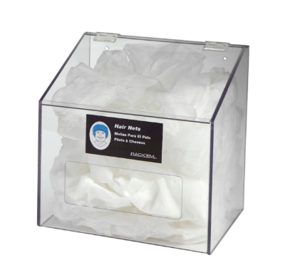 Hair Net/Beard Cover/Shoe Cover / Arm Sleeve Dispenser (With Hole in Front) - 1 Compartment with clear lid, CLEAR PLASTIC, table or wall mount for easy access, 12.5"H x 11.75"W x 9.5"D. Dispenser comes with 4 labels Hair Net, Beard Cover, Shoe Cover, Arm Sleeve & Blank