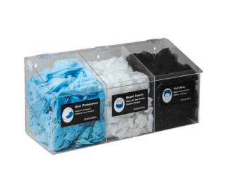 Hair Net/Beard Cover/Shoe Cover/Arm Sleeve - 3 Compartment Dispenser, Each Compartment is 7.5" wide (same compartment size as the 2 compartment Dispenser), CLEAR PLASTIC with clear lid, table or wall mount for easy access, 11.75"H x 22.5"W x 9.75"D. Dispenser comes with 4 labels Hair Net, Beard Cover, Shoe Cover, Arm Sleeve & Blank.
