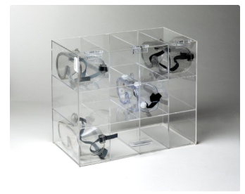 Holds 12 Goggles - CLEAR PLASTIC Table or wall mount for easy access, foam bottom, Compartment Dim: 3.25"W x 3.75"H x 7.375"D. Overall Dim:12.5"H x 14.25"W x 8" D