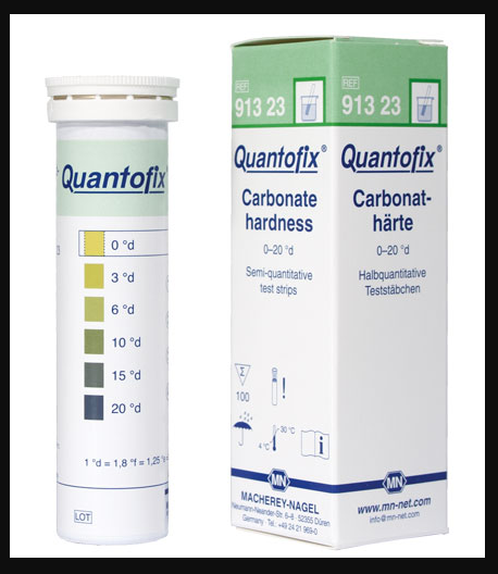 QUANTOFIX Carbonate alkalinity semi-quantitative test strips for the determination of the carbonate hardness. (Strong bases -or other acid-consuming substances cause false results.) Measuring range: 0-3.8-7.5-12.5-18.8-25.0 °e