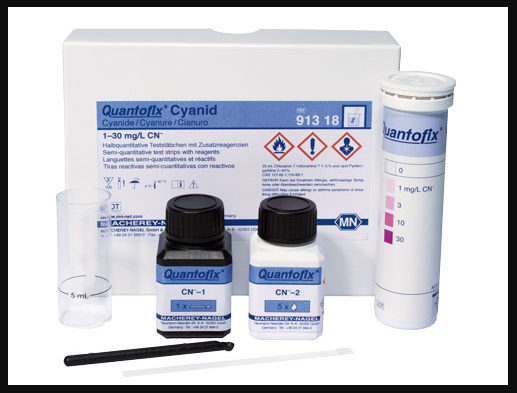 QUANTOFIX Cyanide semi-quantitative test strips and reagents for the determination of cyanide in solutions. Measuring range: 0-1-3-10-30 mg/L CN- EQ Excepted Quantities or __UN 3316 Chemical kit 9 II 0.025 KG ADR/GGVSEB M11 (E) ADR 3.3.1/251: LQ PAX 960 10 KG CAO 960 10 KG