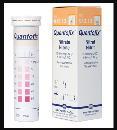 QUANTOFIX Nitrate/Nitrite semi-quantitative test strips for the rapid and reliable determination of Nitrate and Nitrite in solutions. Measuring range: 0-10-25-50-100-250-500 mg/L NO3- 0-1-5-10-20-40-80 mg/L NO2-