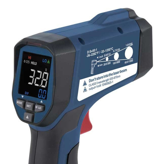 This infrared thermometer features a 50:1 distance to spot ratio that allows users to accurately measure smaller areas from a greater distance. The R2330 has the ability to track maximum, minimum, average and differential readings and includes a bright color display for ease of use in both sunlight and dimly lit environments. Tri-color LEDs quickly indicate when temperatures are within set parameters (green), above (red) or below (blue)