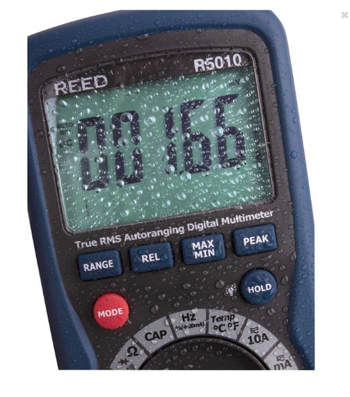 True RMS waterproof multimeter with 40,000 count backlit LCD display.