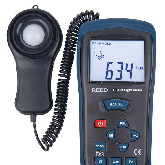 This light meter is capable of measuring in both Foot-candle (fc) and lx. The R8130 features an LCD display with a 42-segment analog bar graph, data hold, min/max, peak and relative functions. The tethered sensor allows for flexible operation while taking measurements