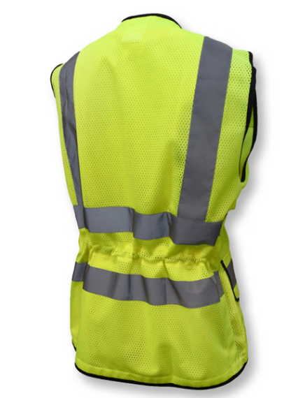 The SV59W ladies vest is a Type R, Class 2 vest that is made to fit and made to last. It features a zipper closure, a large back “plan” pocket, reinforced wear points, and long-wearing web reinforcement along outer edges. Use the cinch located inside the back plan pocket to customize fit. The mesh upper front and back provide breathability and comfort while the tough woven twill fabric used for the pockets enhance durability.