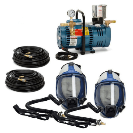 This Full Mask Systems provide a portable air source for one, two or three respirator users. They include one, two or three full mask supplied air respirators, a 1/4 hp, 3/4 hp or 1-1/2 hp breathing air pump, and one, two or three 50' or 100' breathing air hose(s).