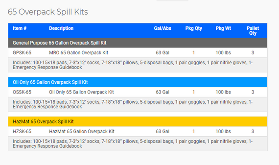 Our MBT 65 Gallon Overpack Spill Kits have all the absorbents you need to clean up medium to large spills. Our 65 gallon Overpack Spill Kit is packed to the top to give you the spill protection you need.