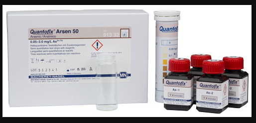 QUANTOFIX Arsenic 50 semi-quantitative test strips and reagents for the determination of arsenic in solutions. Measuring range: 0-0.05-0.1-0.5-1.0- 1.7-3.0 mg/L As3+/5+