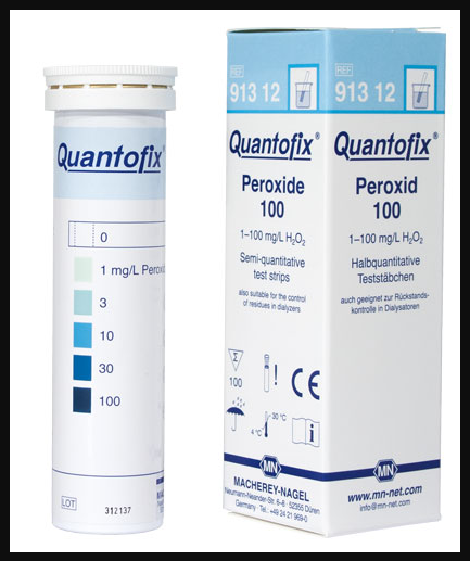 QUANTOFIX Peroxide 100 semi-quantitative test strips for the determination of hydrogen peroxide (H 2 O 2 ) and peroxides in solutions. Measuring range: 0-1-3-10-30-100 mg/L H2O2