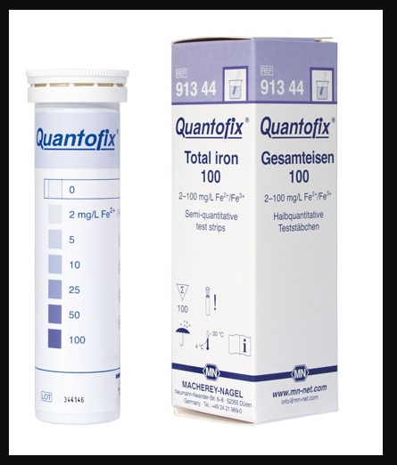 QUANTOFIX Total iron 100 semi-quantitative test strips for the rapid and easy analysis of Iron directly on-site. Measuring range: 0-2-5-10-25-50-100 mg/L Fe2+/Fe3+