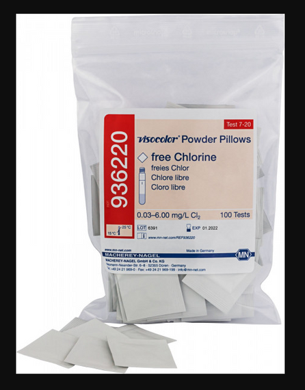 VISOCOLOR Powder Pillows free Chlorine reagent set for photometric determination of free chlorine. Ideal for pool or drinking water analysis. Measuring range: 0.03-6.00 mg/L Cl2
