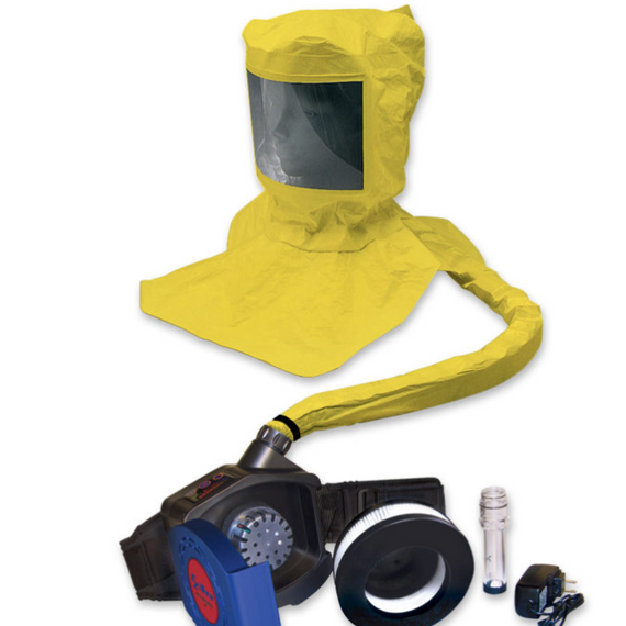 Complete PAPR assembly includes a Poly-coated Tyvek® Hood, breathing tube, blower, battery, waist belt, charger, flow tester, and HEPA filter.