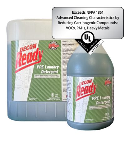 Decon Ready™ is a laundry detergent made for firefighters. Laundry detergent is UL Verified “Exceeds NFPA 1851 Advanced Cleaning Characteristics by Reducing Carcinogenic Compounds: VOCs, PAHs, Heavy Metals.” Go beyond cleaning with Decon Ready™.