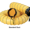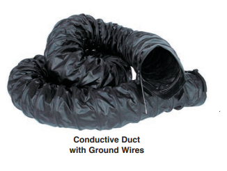 Key Details: • Standard duct yellow vinyl polyester • Conductive duct black vinyl polyester • 8” & 12” diameter with external wear strips – custom sizes up to 36” diameter available • Reinforced internal steel wire hoop – 5” pitch • 6” long attachment cuff, 8 ³⁄₈” or 12 ³⁄₈” diameter, with adjustable belt straps on both duct ends • 12” steel ground wire on both duct ends of conductive duct • Maximum temperature rating 180℉