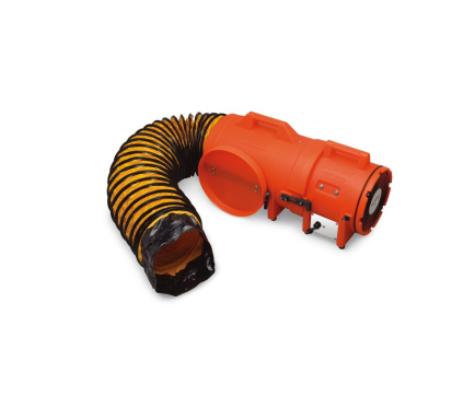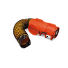 This versatile system features the 8″ Axial blower with canister and your choice of 15′ or 25′ ducting. This lightweight unit is designed with the quick-connect clipping system which allows workers to attach the canister, tools-free, to the input side for powerful extraction or output side for ventilation. The 15′ or 25′ ducting stores conveniently within the canister. Special design features include blower and canister built-in carry handles, built-in On/Off switch and “safety” orange coloration.