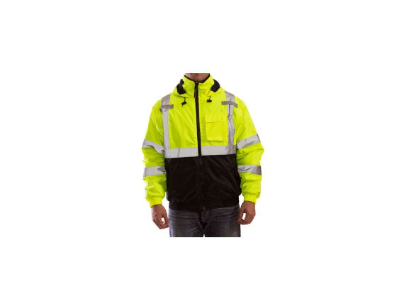 BOMBER II™ - POLYURETHANE ON 210 DENIER WOVEN POLYESTER - SHELL MATERIAL THICKNESS - 6 MIL (.15MM). 120 GRAM QUILTED LINER Class 3 Jacket - Zipper Fly Front - Elastic Waist and Cuffs - Roll-A-Way Hood in Collar - Fl. Orange/Black